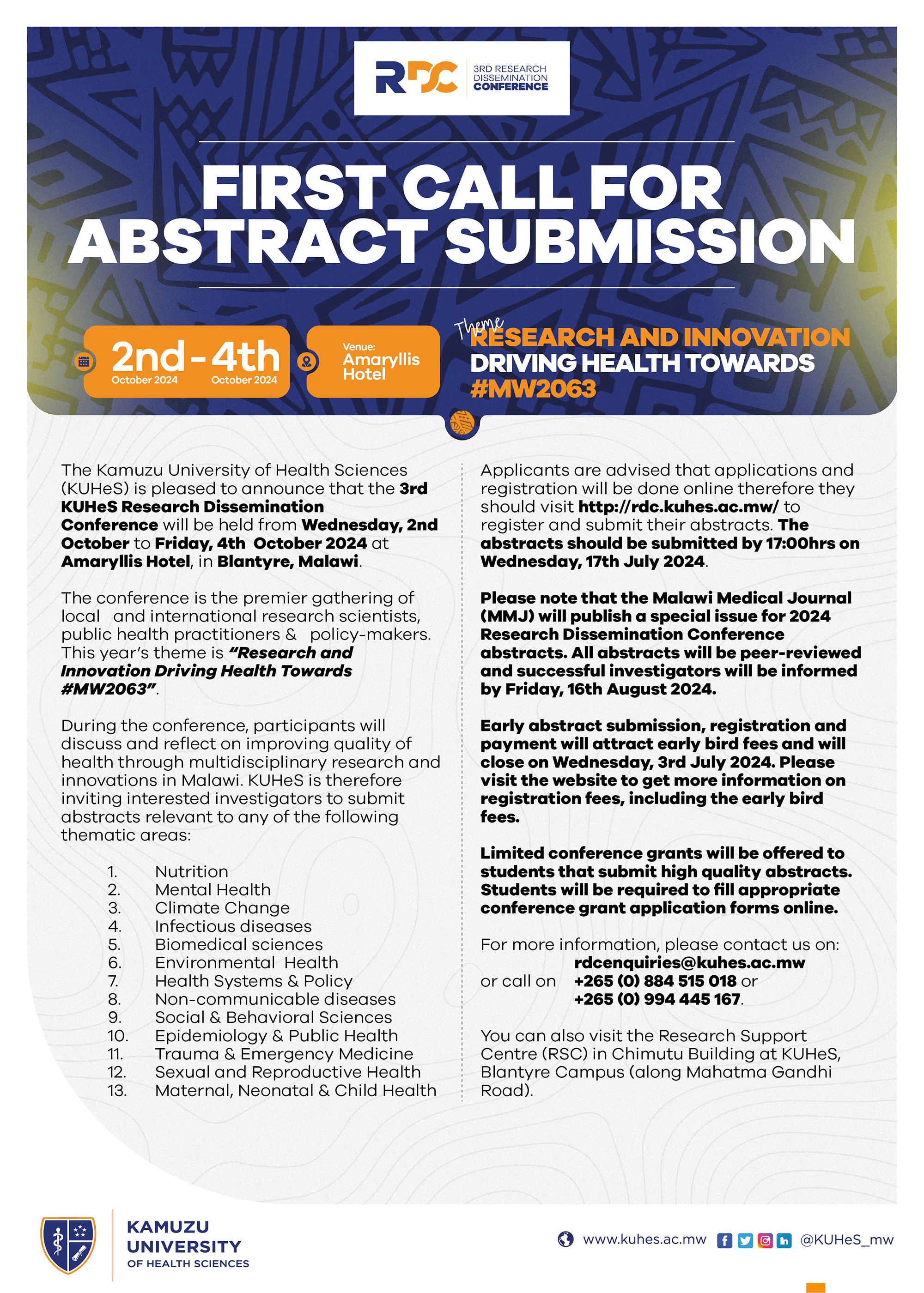 Here is the First Call for Abstract Submission which is now open until Wednesday, 17th July 2024. Please visit the RDC website at http://rdc.kuhes.ac.mw/ for submission guidelines and registration details. Let’s join hands in catalyzing positive change and shaping the future of health in Malawi!